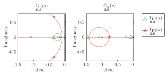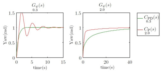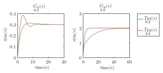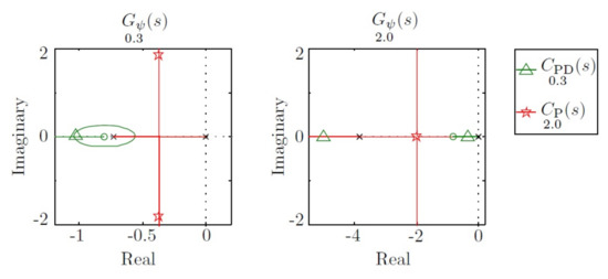 . In this case, the benefits of the first controller are clear. However, when the vehicle travels at 2 m/s, the first controller moves the dominant pole to −0.3, and the second controller moves the two poles to −1. In this case, the benefits are observed on the second controller. This behavior can be observed in