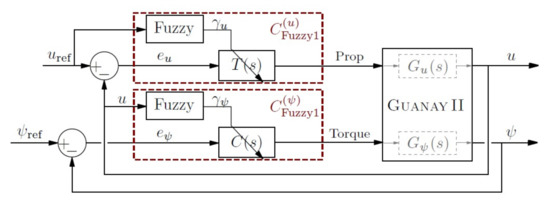 Here, two controllers have been designed to provide autonomous navigation capabilities: one for the inner loop (dynamic), which is in charge of controlling the thrusters to reach a reference yaw and forward velocity; the other for the outer loop (kinematic), which is in charge of generating the yaw and forward velocity references, according to the waypoints and the vehicle’s current state. With respect to the inner loop, two solutions have been presented for velocity and yaw control based on Type-1 TSK fuzzy controller. These controllers were used to manage, at a higher level, different linear controllers designed for specific scenarios, such as different forward velocities. The inner loop developed to control the vehicle’s velocity and yaw results from a vehicle’s linear model in sections obtained from its non-linear model, where the vehicle’s structural characteristics have to be taken into account. When linear controllers (i.e., PID) are used, diffuse techniques were implemented to provide the adaptive navigation capability. On the other hand, the detailed study, development and identification of a dynamic model were required to take into account the hydrodynamic effects and propeller characteristics, which have also been presented.