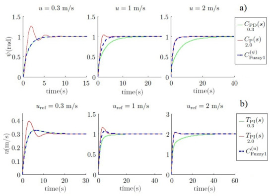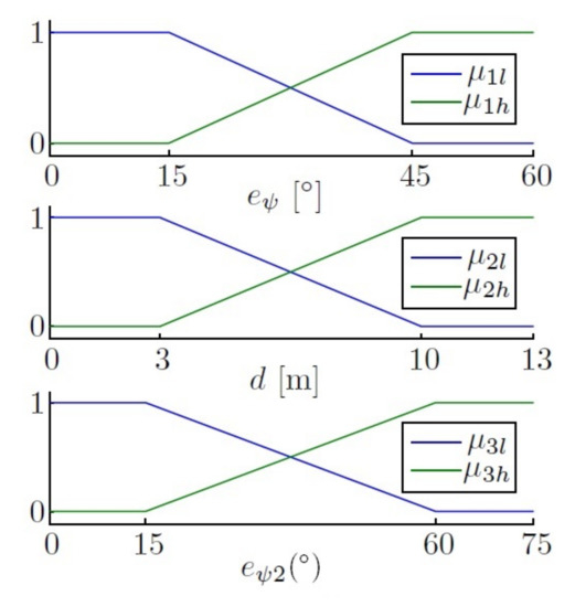 26] use a set of linear controllers adjusted for different forward velocities and then use a gain scheduling controller to integrate them. Here, the same methodology has been followed, but innovatively applying a fuzzy controller, to integrate the different linear controllers. The fuzzy controller allows activation zones to be established, which can be controlled through fuzzy sets. This method showed good navigation performance and was used as interpolation between different rules or linear controls. This approach has also been used recently in other papers (e.g., [