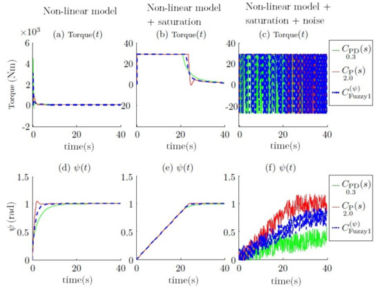 Figure 15c,f), where the torque required is alternatively saturated in both ways. This means that the thrusters will be continuously switching between their maximum and minimum, producing obvious damage. This problem is due to the derivative action of the controller, which amplifies the noise.