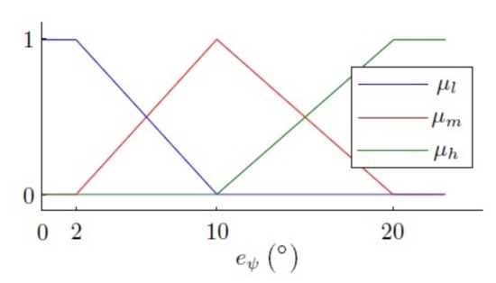 The fuzzy control described above was used to choose the correct control for each scenario; the design aspects were not described. However, here, the fuzzy control is used to interpret the desired value, and so, the design aspects selected for the fuzzification and inference methods were: defining ‘low’, ‘medium’ and ‘high’ error as linguistic terms to control the yaw in a fuzzy way, for