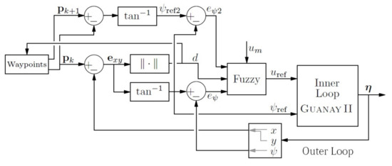 The control system allows user selection of the waypoints as a function of the mission’s goal. Moreover, to reduce the complexity of the control, the design in the horizontal plane has been selected. This strategy is used because in general, most of the missions are carried out at a constant depth. Therefore, the horizontal and vertical controls can be separated without any loss in their performance, as it is a decoupled system. Finally, it has to be considered that Guanay II was designed to navigate on the sea surface; therefore, the main navigation system in this scenario is the GPS. However, this development can be used for immersed navigation, where coordination between GPS and other underwater navigation systems is required.