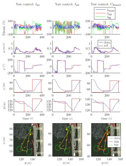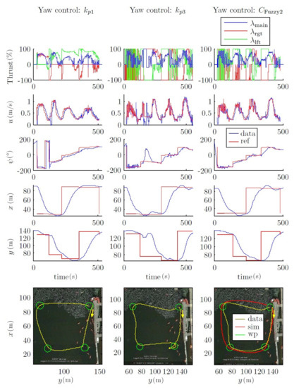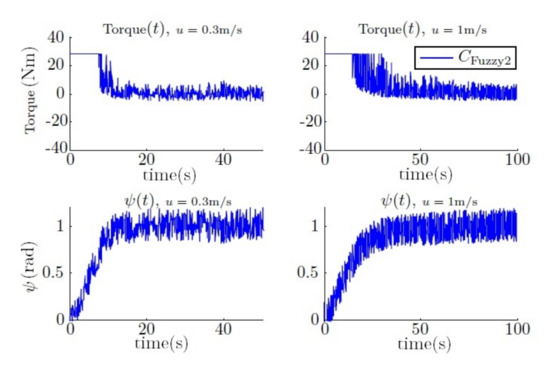 Figure 16. The main advantage of using a vectorial propulsion system is that the vehicle is able to turn over on its own axis when the forward velocity is low. On the other hand, if higher velocities are desired, the turn radius must increase. Consequently, in this case, the time needed to reach the desired yaw is lower, and no differentiation between controllers is appreciated. Therefore, the advantages of a fuzzy controller are not observed.