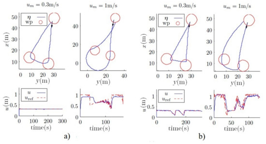 23]. Whereas this is correct for vehicles that usually navigate in open seas, where velocity is mainly constant, this method should not be used in other scenarios, such as in the interior of harbors and canals. In these situations, the variation of the forward velocity becomes relevant, and it is then important to be able to vary the controller’s working point to adjust the paths to the desired ones. Some authors have designed a two-step control approach [