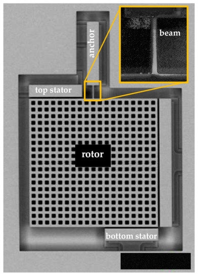 The on-chip testing device proposed in [23] for the estimation of micromechanics-induced uncertainties in polysilicon MEMS, was fabricated through the ThELMA process by STMicroelectronics, Geneva, Switzerland (see e.g., [29]). An SEM picture of the mechanical part of the device is shown in Figure 1: the massive perforated plate (denoted as rotor) and the stators surrounding it were designed to deform, through an electrostatic actuation, the slender cantilever beam shown in the close-up. This beam or spring is connected to the substrate on its top side and to the rotor on its bottom side. Such a statistically determinate mechanical scheme of the movable structure was devised to reduce to a minimum the effects of residual stresses on the measured response to the actuation. Although a slight in-plane offset of the rotor can be induced by gradients of the residual stress field inside the polysilicon film, such effect can be considered negligible (see [24,25]). The target geometrical characteristics of the tested devices are summarized in Table 1. The structure has been packaged at a pressure of 0.35 mbar, so that the working conditions are close to those of similar commercial devices.
