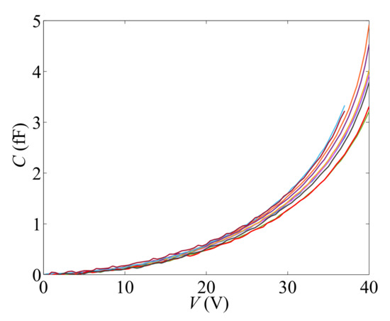 Since the cantilever was purposely designed as thin as possible, in compliance with the micro-fabrication constraints, a remarkable spreading in the mechanical response of nominally identical devices was already reported and is studied here. Ten specimens were taken from a single wafer, and their response measured in terms of capacitance change C against the applied voltage V: results are all collected in Figure 2. The different colors used in this figure to distinguish each single response from all the others will be exploited in Section 5 to correlate the stiff/complaint response in this C–V plane with the final estimates of the unknown parameters characterizing the devices (see below).