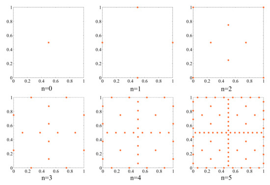 To build such POD-kriging model, a set of simulations for given values of the parameter vector is necessary; this step can be regarded as a sampling within the parameters space. Several sampling methods are available in the literature, such as Monte Carlo [52], Latin Hypercube [53], Halton [54], Sobol [55] and greedy [56] ones. In this work, sampling was based on the sparse grid Smolyak algorithm [57], which had been formerly adopted for kriging sampling in [58,59]. The most important feature of this technique is rooted in its hierarchical structure [60]: new sampling points, required if the surrogate does not attain a required level of accuracy, are plugged into the current set without any rearrangement of the already handled ones. This enriching stage of the surrogate becomes necessary whenever the initial set of the sampling points does not prove adequate to account for all the effects of model parameters on the POM mixture. Among the different sparse grid sampling procedures, the Clenshaw–Curtis one [59,61,62] was used to construct the POD-kriging model. The relevant hierarchical sequence of the sampling points within an exemplary (dimensionless) two-dimensional domain is sketched in Figure 3, at changing degree of interpolation: it is clearly shown that, by increasing the order d, the whole domain of variation of model parameters gets more densely inspected. The relevant number of sampling points to deploy at varying degree d is collected in Table 2, in order to also show that the adopted sampling method allows not to exponentially increase with d, so, with the accuracy of the reduced-order model, the computational burned related to the construction of the POD-kriging model.