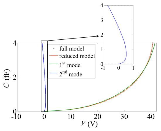 In Equation (6), the reduced-order basis matrix is not supposed to vary significantly with , as the snapshots collected in are assumed to provide physically-sound and accurate information on the actual system behavior, independently of . The combination coefficients instead depend on , as different parameter values may selectively increase the importance of each mode in . Since the system response is supposed to smoothly depend on O and E up to pull-in, a smooth interpolation is looked for within their ranges of variation. Accordingly, system nonlinearities linked to the effect of on the C–V curve are covered by the interpolation functions ; nonlinearities related instead to the C–V plot itself at assigned , are (approximately) accounted for when building the modes retained in .