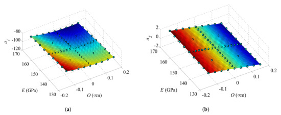 The kriging interpolation functions (see Section 3.2) are reported in Figure 5 over the whole domain of variation introduced before. It is shown that nonlinearly varies with O and E; instead varies almost linearly with O, being almost independent of E. This latter feature, together with the difference in the amplitudes of the two interpolation functions in the studied range, allow stating that, in case of variation of the Young’s modulus E only, the C–V curve can be fairly well presented using one POM only, whose amplitude nonlinearly depends on the value of E itself.