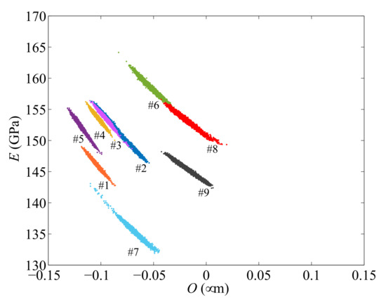 The results of the TMCMC analyses are plotted in Figure 6, in terms of the spreading of the samples at the end of the identification procedure. Results are relevant to nine specimens, out of the ten experimentally tested; those relevant to the last specimen will be discussed later in this section, and they are not included here as the procedure did not provide convergence towards feasible values of the two unknown parameters, at least within the considered domain of variation. The same color coding adopted in Figure 2 is managed here, as already commented on, to provide a visual correlation between the C–V response and the obtained estimates of O and E. Outcomes show that the values of overetch and Young’s modulus vary from one specimen to another: for all the cases, O turns out to be bounded between −0.1 m and 0, while E significantly varies between 130 GPa and 160 GPa. Sample distributions also testify to a negative correlation between O and E: larger values of O correspond to lower values of E, and vice versa. Such correlation between the two unknown parameters and the dispersion of the samples corresponding to each device reveal a potential ill-posedness of the problem due to the existence of locally flat areas of the objective function implicitly handled in the identification procedure. Dealing with such objective function by means of a deterministic approach (see e.g., [24]) often fails to provide a reliable estimation of O and E for all the specimens.