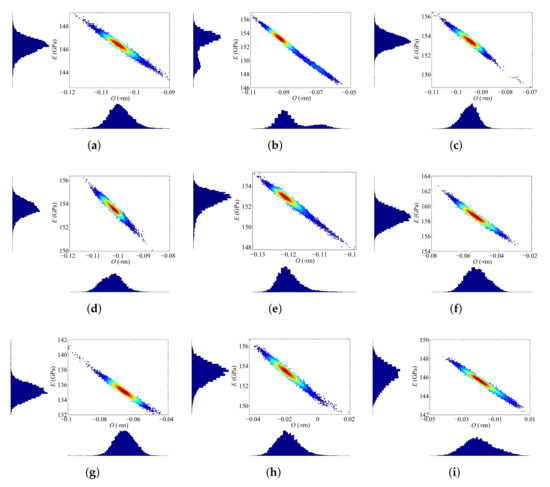 The final specimen-dependent estimates can be better assessed by looking at the distributions of the samples, shown together with the histograms of parameter distribution in Figure 7. Such histograms provide a complete insight into the statistical properties of sample scattering. If estimates of O and E are given in terms of mean value and variance only, confidence intervals can be established, but they are affected by the presence of outliers (see e.g., Figure 7c) improperly estimated in the case of multimodal distributions (see e.g., Figure 7b), or in the case of heavily skewed distributions (see e.g., Figure 7e). One may instead adopt the mode of each posterior distribution as a more appropriate estimate, as it represents the value that appears most often in it. Accordingly, the estimated values and , along with the relevant standard deviations are collected in Table 3 for the nine devices. The reported results show that overetch varies in the interval (−0.122 m −0.020 m), while the Young’s modulus varies in the interval (135.06 GPa 158.65 GPa).