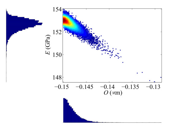 To identify the characteristic values and the dispersion of parameters O and E, as featured by the batch of devices that furnished the responses gathered in Figure 2, an inverse problem has to be solved. By comparing the experimental data with the results of micromechanics-informed numerical simulations, the mentioned stochastic properties of the parameters can be identified, also handling the measurement error. Such characterization of the polysilicon film will be therefore richer in the content of information if compared to those provided in [23,24], for which the ill-conditioning of the inverse problem [33] would have potentially affected the solution.