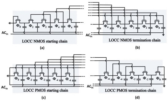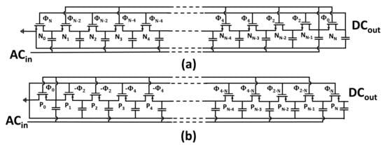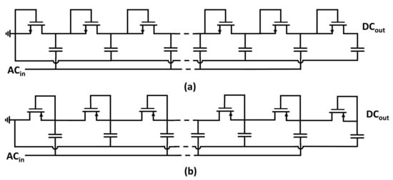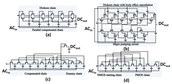 Figure 9d) to overcome the limitations imposed by the dummy chain in the rectifier design. The technique uses both forward-compensated NMOS transistors and backward-compensated PMOS transistors in a single multiplication chain. The dual choice of NMOS and PMOS transistors allows full exploitation of each pumping node in the rectification chain. Thereby, the output voltage can be directly attained at the output of the last pumping node, which is implemented by an uncompensated diode-connected PMOS transistor to reduce the leakage losses. To maintain the incremental voltage constant across the multiplier chain, proper scaling of the pumping cells was adopted.