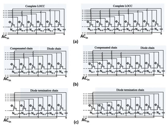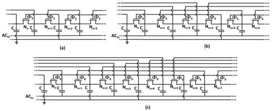 Figure 6. In Dickson-based voltage doublers (VDs) relying on a single power source, only even compensation orders are allowed due to the presence of alternating phases in the inner nodes of the rectification chain. Under the assumption of a multiplier chain implemented by maximizing the compensation order (shown in