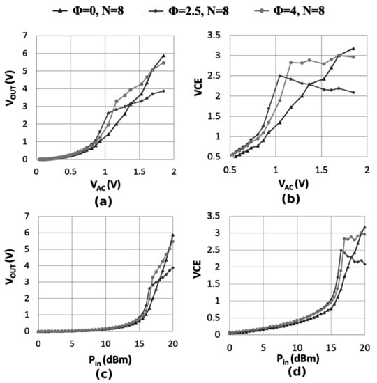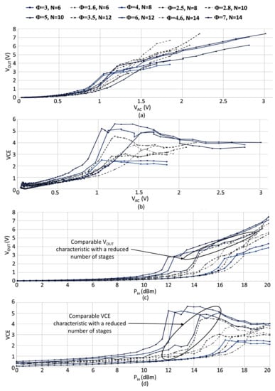 Figure 14 plots the measured output voltage and VCE versus the input power and voltage, respectively, for three 8-stage voltage multipliers. The attained measurements agree with the theoretical conjectures and simulations discussed in