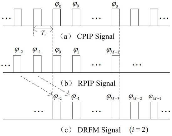 In this paper, the velocity false target refers to the jamming signal emitted by the DRFM repeat jammer that is set on the moving target (called self-defense jammer) to protect the target itself. To this end, the jammer needs to conduct the following steps to generate a jamming signal that can be coherent to the transmitted signal of the radar and form the false velocity targets after being processed. Firstly, the transmitted pulse is intercepted. Then, the key parameters such as carrier frequency, pulse width, initial phase, etc., are obtained. Thirdly, translational modulation and micro motion modulation function are generated based on the information gained, and the intercepted pulse is modulated by the functions. Finally, the modulated pulse will be retransmitted [13]. Based on this work flow, the jamming pulses are coherent to the pulses transmitted by radar and easy to get the radar processing gain. However, when the radar transmits RPIP signal, the jammer cannot adapt easily to the change of the pulse initial phase in each PRI. Hence, the pulse emitted by the jammer will lag iPRI () behind the pulse transmitted by the radar [3]. Concretely, at the mth PRI, the jammer emits the modulated pulse, which is intercepted in the th PRI. As for the case that , the emitted pulses will be generated based on the corresponding pulses intercepted during previous CPI, or generated randomly (at the beginning period of jamming). Figure 1b,c show the RPIP pulses transmitted by the radar and the typical case of the jamming pulses received in one CPI (when ).