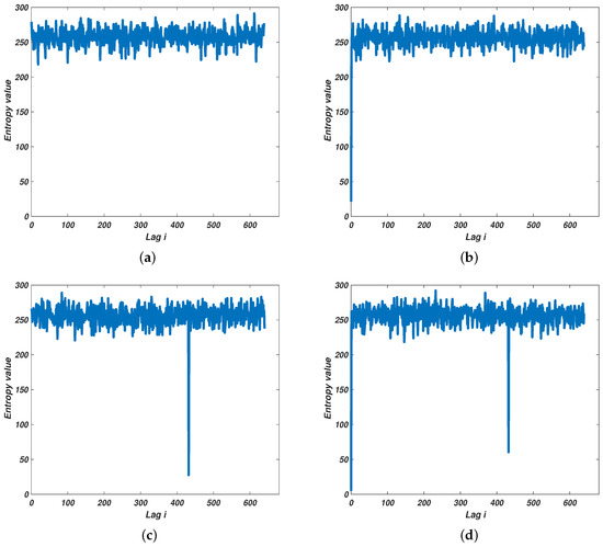 Figure 3a–d illustrate the cases that the component of could be. The x-axis and the y-axis of Figure 3a–d correspond to possible lag information, i.e., i, and the corresponding entropy value for each possible i. An additional case is shown for better comparison that no signal is received (see Figure 3a). Accordingly, if no output from a certain channel is much lower that the rest (see Figure 3a), it indicates that no target or jamming is detected. If the output of the first channel is the only negative peak (one which is considerably lower than the rest) in the entropy spectrum, then only exists. (corresponding to Figure 3b). When the lowest output is from other channel but not the first channel and the first channel’s output is not much lower than the others (as shown in Figure 3c), only exists. As for the last case, two outputs (one is from the first channel) are the two much lower points in the entropy spectrum, which denotes that and exist simultaneously.