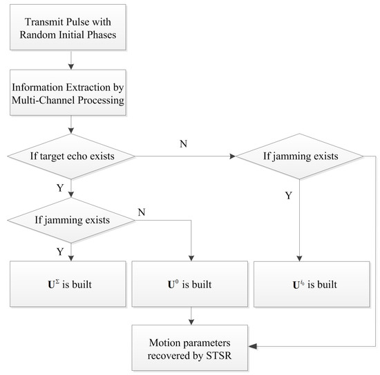 As illustrated in Figure 5, the RPIP signal is transmitted firstly (denoted as ) and, if a moving target is detected, will be received by the radar. Simultaneously, the jammer may generate the jamming signal . The signal that the radar received needs to be analyzed regarding its components firstly by using the multi-channel processing method. If and are contained, the true target dictionary and jamming dictionary will be built. When only or is contained, the corresponding dictionary will be built. Then, the STSR method is applied to recover the motion parameters in the time-frequency domain. Note that the working flow is valid for both TMFT and MMFT.