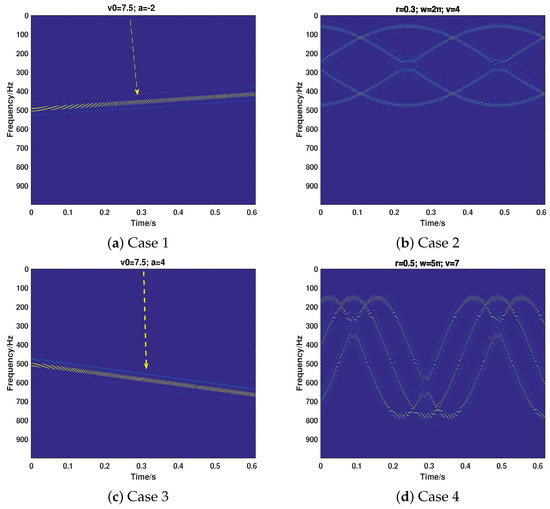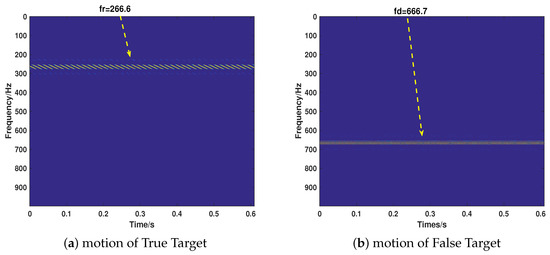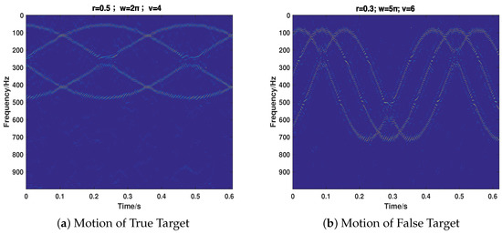 Then, we consider the most common cases that the target echo and jamming signal exist simultaneously, putting emphasis on testing the proposed strategy’s performance of separating the two signals and recovering their motion parameters. We take the motion of the target into full consideration, which includes ULM (Case 5), UALM (Case 6), ULM with rotation (Case 7), and UAML with rotation (Case 8). The corresponding parameter settings are shown in Table 2. As can be seen from Figure 7, Figure 8, Figure 9 and Figure 10, the target echo and jamming signal can be separated accurately under all cases considered. The ULM motion will be recovered as a straight line in a time-frequency domain, as depicted in Figure 7. The velocity will be gained by applying the corresponding Doppler frequency into the Doppler formulation, namely, [6,7].