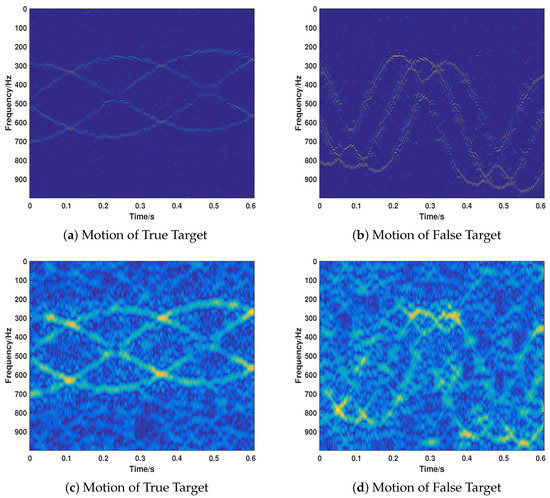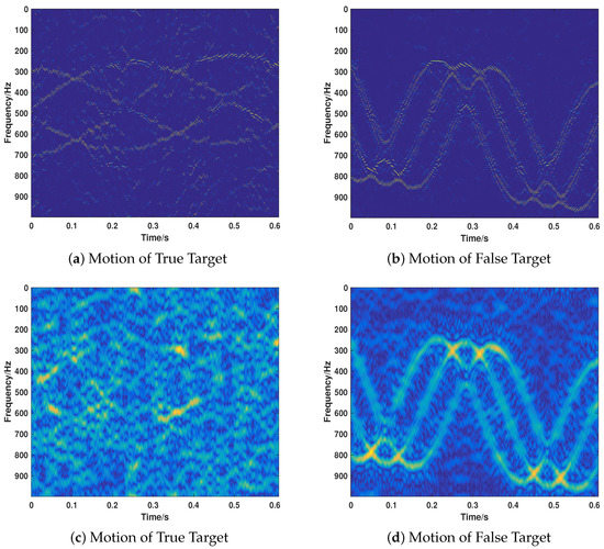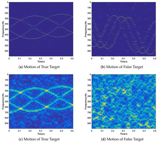 Here, the validity of our proposed method under different motion cases with regard to recognizing the target and separating the true motion target and false motion target is tested. It should be noted that the signal noise ratio (SNR) is 20 dB and the jamming signal ratio (JSR) is 7 dB. Firstly, we test its performance on the cases that only true motion targets or false motion targets are included. We consider that the motion of the true and false target can be either UALM or micro motion. The parameters are set as shown in Table 1. Case1 and Case 2 are the cases that only the true target echo is received and the motion can be either UALM (Case 1) or Micro Motion (Case 2). Case 3 and Case 4 take the case that only jamming signal is received. The corresponding results of Cases 1–4 are shown in Figure 6a–d. As shown in Figure 6, the proposed method can correctly identity the component of the received signal and recover the corresponding motion parameters.