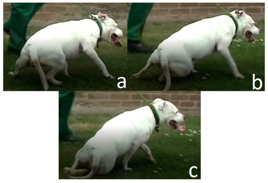 (a) Injured dog at balance, (b) Dog at the critical timing before falling, (c) Dog has fallen.