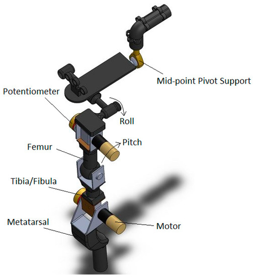 We designed the robot test bed to be physically representative of the adult dachshund hindquarters. The two legs of the front quarters are forward of the damaged spinal cord, and are still under the direct control of the dog. We assume that the front limbs provide support and stability for the forward half of the body, and replace these with a fixed mount for the mid-body of the dog that allows for appropriate rotation while also providing a measure of stability from the front quarters. The rear end of the robot includes the pelvis and two rear legs. Each leg includes 3-D printed plastic parts, which play the role of femur, tibia/fibula and metatarsal bones in the actual dog. The femur is attached to pelvis by the hip joint. The hip joint is designed to provide two rotational degrees of freedom in pitch and roll. Only the pitch rotation of this joint is controlled by a motor, and is used to mimic the change in hip joint angle during walking. The roll rotation allows the dog to move the leg laterally in and out from the centerline of the body. We have added a compliant spring to constrain the roll motion, based on veterinarian experience that ligaments and other connective tissue perform a similar function. The distal end of the femur is fixed to the tibia at the knee joint. In subsequent sections, we will show that kinematic evaluation of the normal dog gait indicates very little motion of the knee joint, and so we have simplified our bionic dog leg with a fixed knee joint. The hock joint, linking tibia and metatarsal, is also designed with motorized actuation. We provide rotation and control to match the motion found in this joint on the typical dog. The model of one leg and pelvis of our robotic dog test-bed is shown in Figure 2. The length of femur, tibia/fibula, and metatarsal and toes are 70, 70 and 105 mm, respectively. These bone sizes are based on x-ray image of the typical Dachshund dog [35].