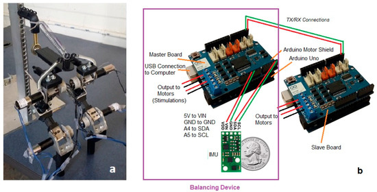 (a) The replica, (b) Arduino boards, IMU, and electronic connections.