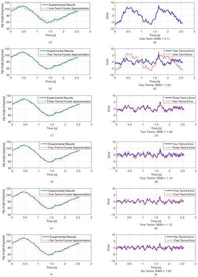 Hip joint angle as a function of time (a1) One term of Fourier series approximation (a2) One term approximation error (b1) Two terms of Fourier series approximation (b2) Two terms approximation error (c1) Three terms of Fourier series approximation (c2) Three terms approximation error (d1) Four terms of Fourier series approximation (d2) Four terms approximation error (e1) Five terms of Fourier series approximation (e2) Five terms approximation error (f1) Six terms of Fourier series approximation (f2) Six terms approximation error.