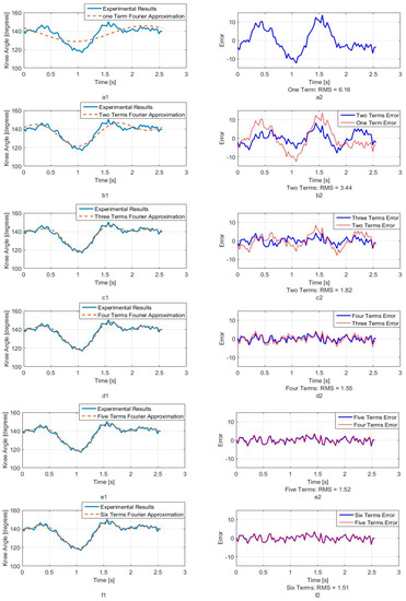 Knee joint angle as a function of time. (a1) One term of Fourier series approximation (a2) One term approximation error (b1) Two terms of Fourier series approximation (b2) Two terms approximation error (c1) Three terms of Fourier series approximation (c2) Three terms approximation error (d1) Four terms of Fourier series approximation (d2) Four terms approximation error (e1) Five terms of Fourier series approximation (e2) Five terms approximation error (f1) Six terms of Fourier series approximation (f2) Six terms approximation error.