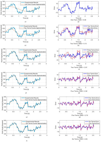 Hock joint angle as a function of time. (a1) One term of Fourier series approximation (a2) One term approximation error (b1) Two terms of Fourier series approximation (b2) Two terms approximation error (c1) Three terms of Fourier series approximation (c2) Three terms approximation error (d1) Four terms of Fourier series approximation (d2) Four terms approximation error (e1) Five terms of Fourier series approximation (e2) Five terms approximation error (f1) Six terms of Fourier series approximation (f2) Six terms approximation error.