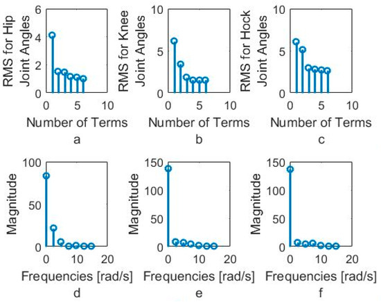 Figure 8d–f show the magnitude of the steady-state and subsequent terms in the Fourier series at each frequency for hip, knee and hock joint angles functions. These magnitudes confirm our findings using the RMS error to determine the number of Fourier terms to use. From Figure 8d, for the hip angle, we see the magnitude of the third and subsequent terms get very small indicting we can use just the first two terms for an accurate approximation. For the knee and hock joints, Figure 8e,f show that we can use just first three terms for an accurate approximation of the joint trajectories.