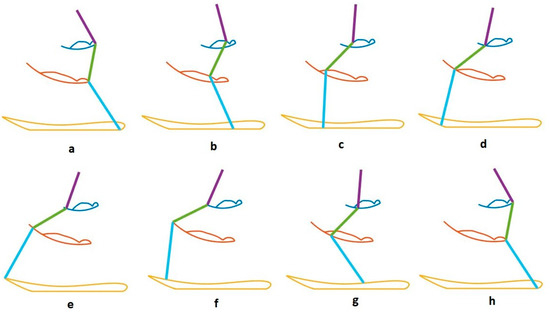 We show snapshots of the modified gait of bionic dog walking on the treadmill in Figure 11. The hip and hock joint angles are the same in both Figure 10 and Figure 11a–d and we show that the knee joint is almost fixed during this stage of walking. The joint trajectories are different between Figure 10 and Figure 11e–h. The differences are minor, and only occur during the swing forward phase when there is no contact between the foot and the ground, and so these differences do not affect the motion and balance of the bionic dog hindquarters. While the gait we produce for our test-bed is not an exact dog gait, it is still a good approximation for understanding the additional balancing stimulation necessary for correcting an abnormal gait and restoring stability and balance.