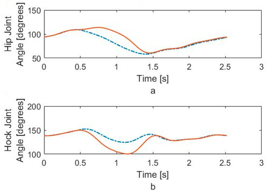 To produce our simulated dog gait, we have modified both hip and hock angles in order that the robot dog lift its toes during walking. These modified angles for hip and hock joints, that can correct the gait of dog are shown in Figure 12a,b. The trajectory and joint angles match the experimental data during the stance phase but they are different during swing phase. These trajectories and angles impart the same foot-ground interaction but keep the knee fixed, while also limiting the hip motion.