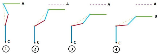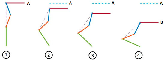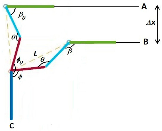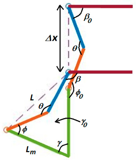 We have introduced , the angle of metatarsus with the vertical. In Figure 17, the initial value of this angle, , as shown, is zero. It is possible that this value is not zero at initial leg position and we consider this value in our formulation. is the length of metatarsus and we can always calculate the value of using our bionic dog servo position sensors:
