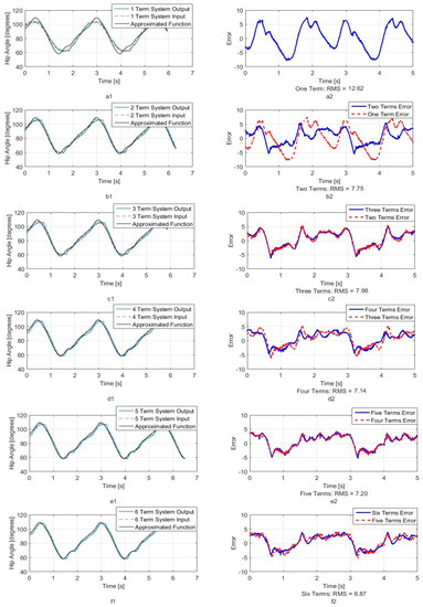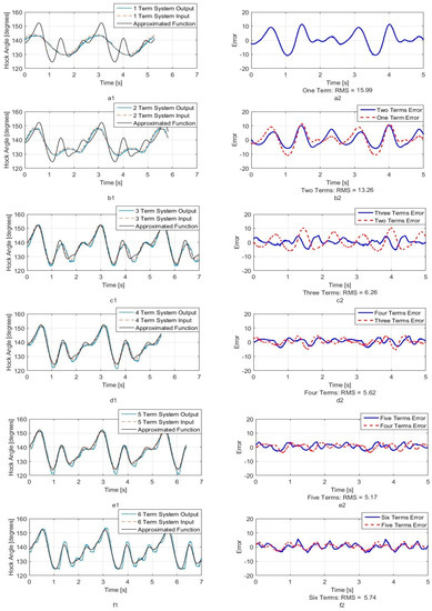 System output for hock joint angle. (a1) One term of Fourier series system output (a2) One term output error (b1) Two terms of Fourier series system output (b2) Two terms output error (c1) Three terms of Fourier series system output (c2) Three terms output error (d1) Four terms of Fourier series system output (d2) Four terms output error (e1) Five terms of Fourier series system output (e2) Five terms output error (f1) Six terms of Fourier series system output (f2) Six terms output error.