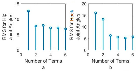 RMS error between system output and approximated function for (a) hip joint angles and (b) hock joint angles based on the number of Fourier series.
