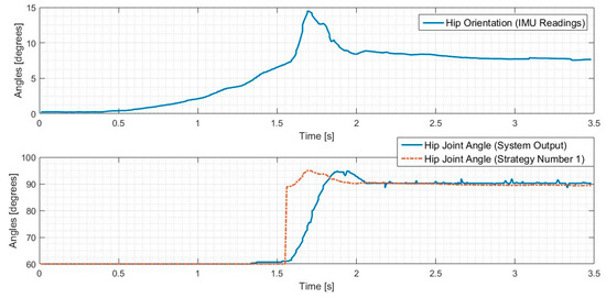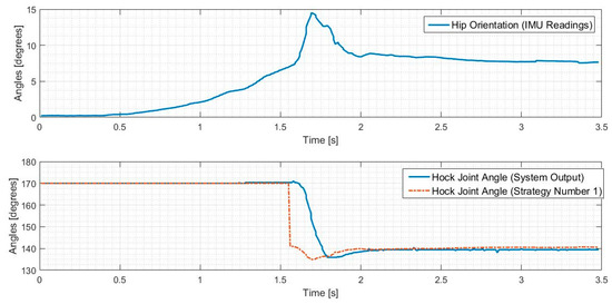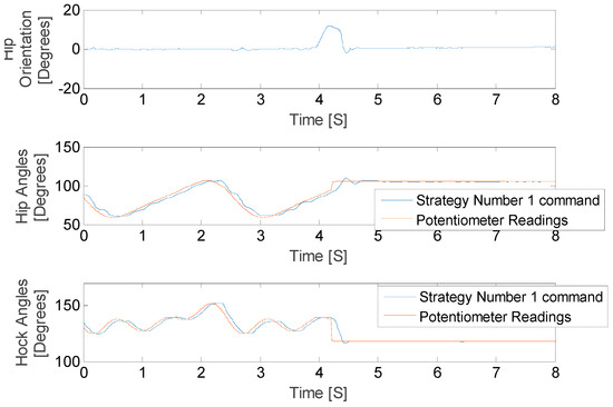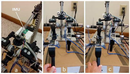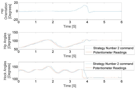 We use our IMU attached to the pelvis to sense the horizontal angle of the pelvis. For our test-bed, we designate one of the Arduino controllers as the master, in charge of reading the IMU for balancing control, as well as controlling the hip and hock joint of the right rear leg using the feedback potentiometers and the joint motors. The second Arduino is designated as the slave controller, and is used only to control the motion of the hip and hock joints of the left rear leg, so is not part of the balancing device. The actual hardware for the bionic test-bed is shown in Figure 4. We start by analyzing the walking gait of normal dogs to identify the motion and orientation of the body during normal activity. As part of the balancing device, we use our IMU attached to animal hindquarters to measure speeds and accelerations. We use the IMU to determine the angle that the sensor makes with the ground. The sensor is mounted on the pelvis of the robotic dog, and would be worn on the back of the patient dog. The accelerometer and rate gyros in the IMU are combined to provide a measurement of the angle of the pelvis with the ground. Essentially, the gravity vector is measured by combining the three accelerometer readings so that we know which way is “down” relative to the dog pelvis, although we also combine the gyroscope information to help filter the noise using “Direction Cosine Matrix filter” [43]. This IMU measurement of the pelvis angle allows us to identify the critical timing during walking that will indicate an impending fall.