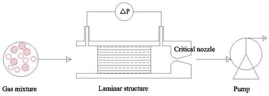 In the system, gases driven by a pump passes through a laminar structure and a critical nozzle in turn (Figure 1). As gases flow through the laminar structure, the pressure drop between its ends is measured. The pressure drop of different concentrations of gas mixtures is different. Principles governing the system are based on choked flow behavior and Hagen-Poiseuille law.