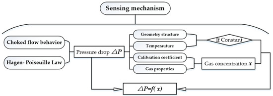This part describes the sensing process. As shown in Figure 2, the choked flow behavior and Hagen-Poiseuille law are analyzed firstly, and based on these two principles pressure drop equation is deduced. The pressure drop is related to four parts: geometry structure, temperature, calibration coefficient, and gas properties. Then, these four parts are analyzed. For calibration coefficient, and gas properties parts, they can be expressed as a function of gas concentration, and if the geometry structure and temperature are kept as constant, the pressure drop is only related to gas concentration x; in other words, the pressure drop is a function of gas concentration. Therefore, according to the pressure drop, the gas concentration can be obtained.