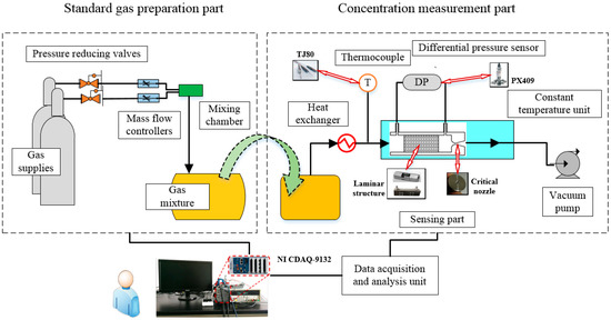 A schematic of the constructed experimental apparatus is shown in Figure 4. The system consists of a standard gas preparation part and a concentration detection part.