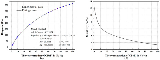 In the beginning, the laminar structure used in the tests is a commercial laminar flowmeter (Model 50MJ10-11), and the throat diameter of the critical nozzle is 0.88 mm. As can be seen in Figure 5a, the experimental results showed that as the volume concentration of CBrF3 increased, the response increased, and the monotonous trend indicates the detection is feasible. It is not convenient to use the theoretical model to fit the experimental data owing to its complexity functioning and the difficulty of acquiring precise gas properties data (the theoretical model can provide accurate predictions and instructions for sensor design as discussed in Section 4.2); a more preferable method involves using the fitting equation, and the model was used, which fitted the experimental data very well, and we found it was also appropriate for other cases, as shown below. The sensitivity is defined as . From Figure 5b, the sensitivity decreased with the increasing concentration. It indicated that the low concentration range would be more precise than high concentration range.