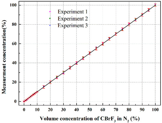 Three experiments were conducted. Compared with calibration curve, the absolute error with variation of the volume concentration of CBrF3 was shown in Figure 6. It can be found that the absolute errors are no more than ±0.5% from 0 to 10%, and at higher concentrations, the absolute errors are within ±1.5%.