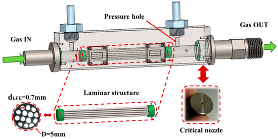 As shown in Figure 4, the critical nozzle is manufactured according to ISO 9300. Two kinds of laminar structure are used in the paper: commercial Model 50MJ10-11 (Meriam Process Technologies, Cleveland, OH, USA) and the self-manufactured one (as described in Section 4.1). The temperature sensor used is a T type thermocouple (TJ80, Omega Engineering Inc., Norwalk, CA, USA) with a range of 0–200 °C. The differential pressure sensor used in the paper (PX409, Omega Engineering Inc.) has a range of 10 in H2O with a output signal of 4 to 20 mA, and its accuracy is 0.08% BSL. Its response time is less than 1ms. All signals were collected by a NI CompactDAQ controller (NI CDAQ-9132, National Instrument Inc., Austin, TX, USA).