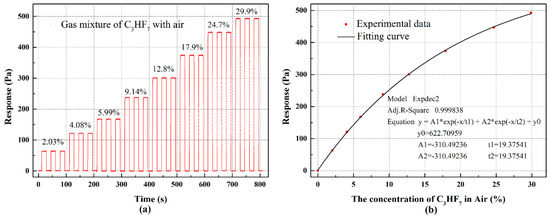 The gas mixture of C3HF7 with air ranging from 0 to 30% is researched to verify the feasibility of the self-manufactured sensing part, and the throat diameter of critical nozzle used in the experiment is 0.682 mm. The response/recovery time was measured through quickly switching gases using a solenoid valve, with a response time of less than 10 ms. From Figure 8a, it showed the evolution of the signal during the entire sequence; the detector signal could be quickly stabilized after switching the concentration. For the concentration switching between 0% and 29.9%, the time T90 (time to achieve 90% actual concentration) of response time and recovery time is 0.21 s and 0.26 s, respectively. Good repeatability was also shown. Figure 8b shows the response increased with the increasing of the concentration of C3HF7, and the fitting equation model can also fit the experimental data well.