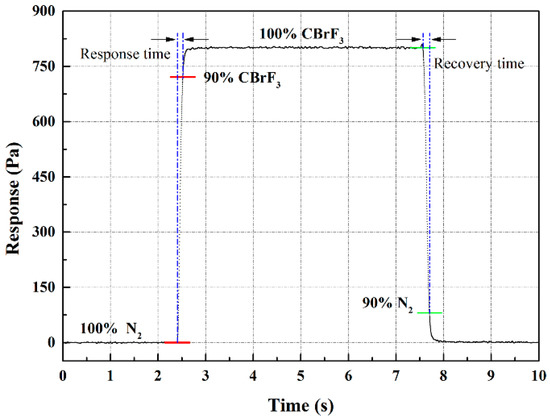 To compare the response/recovery time with the commercial one, the gas switching experiment between 100% N2 and 100% CBrF3 was conducted, and the throat diameter of critical nozzle used is 0.801 mm. As shown in Figure 9, the response time is 0.12 s, and the recovery time is 0.15 s. The results show that the response/recovery time can be greatly improved by changing the structure of the sensing part. The time is correlated with geometry construction of laminar structure, including the arrangement of capillary tubes and their size (number, diameter, length); also, the shape of critical nozzle has a great influence on the response/recovery time. A more systematic approach is needed to research the effect of these parameters on time in future works.