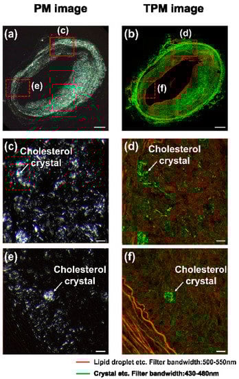 - Suhalim, J.L.; Chung, C.-Y.; Lilledahl, M.B.; Lim, R.S.; Levi, M.; Tromberg, B.J.; Potma, E.O. Characterization of cholesterol crystals in atherosclerotic plaques using stimulated Raman scattering and second-harmonic generation microscopy. Biophys. J. 2012, 102, 1988–1995. [Google Scholar] [CrossRef] [PubMed]