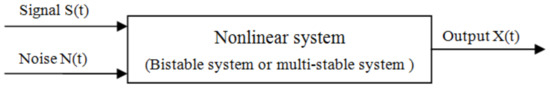 As the bistable stochastic resonance can enhance the weak low frequency signal by utilizing the noise energy reasonably, it can be thought as a nonlinear low pass filter in some literature [15,23]. Therefore, according to the careful study of some model based research works on the signal processing and analysis [24,25,26], the bistable stochastic resonance here is thought as a nonlinear system and the noisy signal [27] containing the periodic signal and strong noise is considered as the input of this nonlinear system shown in Figure 4. Then, the weak characteristic frequency can be obviously enhanced in the output signal. Since there will be multiple stable points for the high order potential function, the nonlinear system also includes multi-stable system besides the bistable system.
