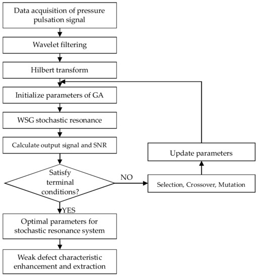 where is the amplitude of weak characteristic frequency in the frequency spectrum. represents the length of signal and stands for the amplitude of each spectrum line in the frequency spectrum of output signal. The purpose of GA is to search for optimal parameters so that the optimal SNR can be obtained, as the larger SNR means the better characteristic enhancement performance. The flowchart of the proposed method is illustrated in Figure 5 and detailed procedures are described as follows.