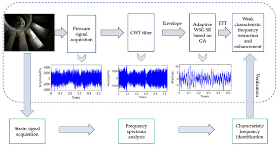 As the weak characteristic frequency induced by the blade crack defect is usually difficult to be identified, the proposed method is used here to improve this problem. Considering the strain method is not suitable for the long-term condition monitoring of all the blades, pressure pulsation signal is adopted in this paper. Then, the proposed CWT-WSG SR method combined with GA is used to enhance and extract the weak defect characteristic frequency from the pressure signal. Strain data will also be sampled and analysed to evaluate the reliability and effectiveness of the analysis result obtained by using the proposed method. In the condition that the consistent defect characteristic frequency can be extracted from both strain signal and pressure pulsation signal with the proposed method, it can be verified this method is effective and has potential in the application of long-term condition monitoring and weak defect warning for large-scale centrifugal compressor blades. The detailed scheme is shown by the following system diagram seen as Figure 6.