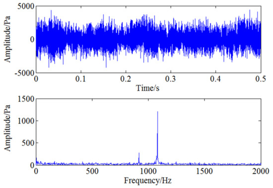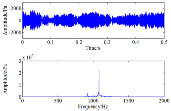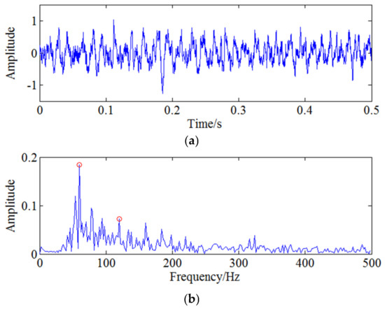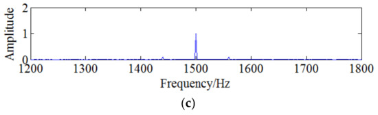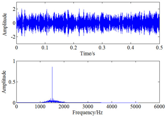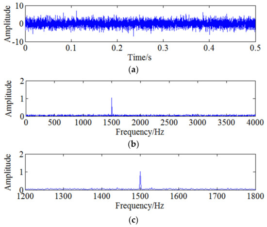 Wherein the carrier frequency Hz and the modulation frequency Hz. Parameters and . The sampling frequency is Hz and the number of sampling points is 5120. The obtained amplitude-modulated signal is shown as Figure 7a and it is analysed by FFT to obtain the frequency spectrum which is shown as Figure 7b, where 1500 Hz is the main frequency and 60 Hz is the modulation frequency. Amplifying the frequency information around 1500 Hz to obtain Figure 7c and it can be clearly seen that there exists sideband around 1500 Hz, which indicates 60 Hz is modulated to the carrier frequency. In order to simulate the actual situation, strong Gaussian white noise with SNR = −9 dB is added to the simulation signal and the obtained time domain signal is shown as Figure 8a. Figure 8b shows the corresponding frequency domain. It can be found that the side band information is difficult to be identified due to the noise interference. Amplifying the frequency domain near 1500 Hz shown by Figure 8c, however, the characteristic frequency is still difficult to obtain through side-band analysis due to the strong noise interference.